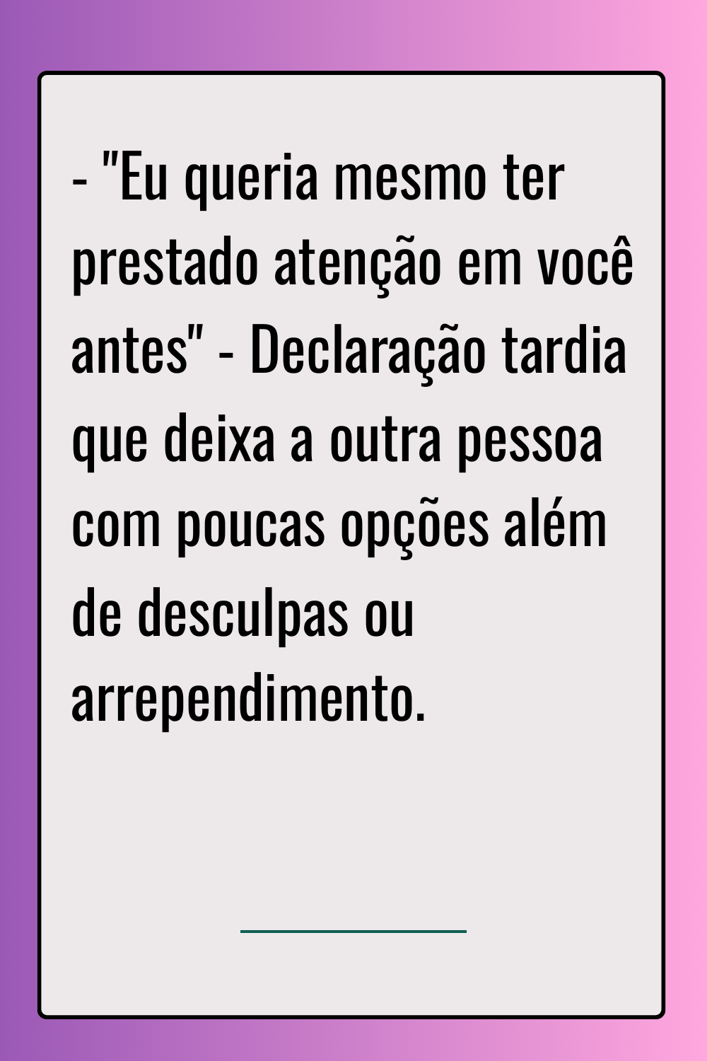 – “Eu queria mesmo ter prestado atenção em você antes” – Declaração tardia que deixa a outra pessoa com poucas opções além de desculpas ou arrependimento.